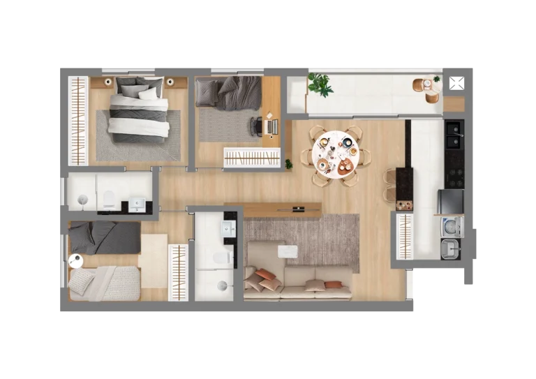 - Plantas flexíveis (escolha entre 2 quartos + sala estendida ou 3 quartos)